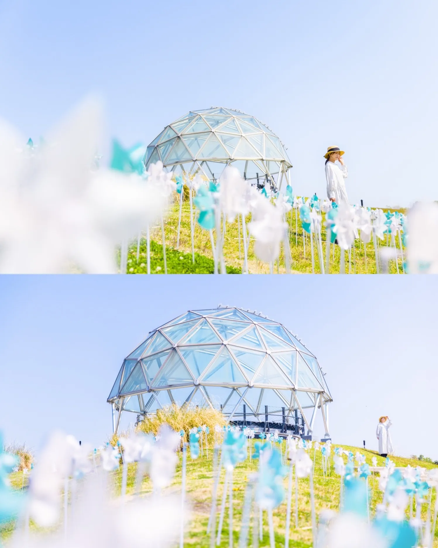 四季の風を表現した色とりどりの「風ぐるま」や季節の花や緑を運ぶ「草原を渡る船」など、風の丘の映えスポットで撮影いたします✨